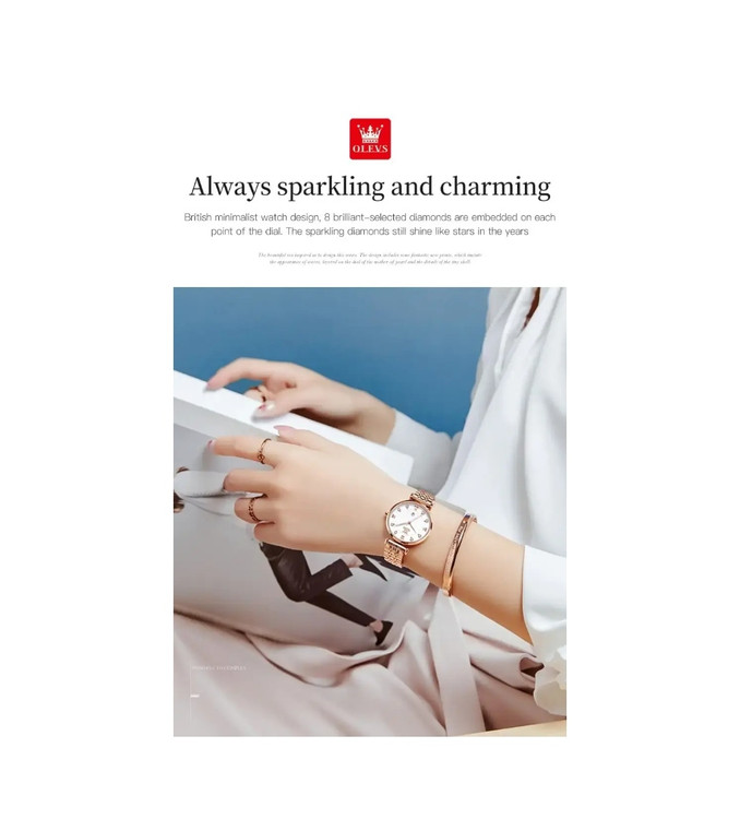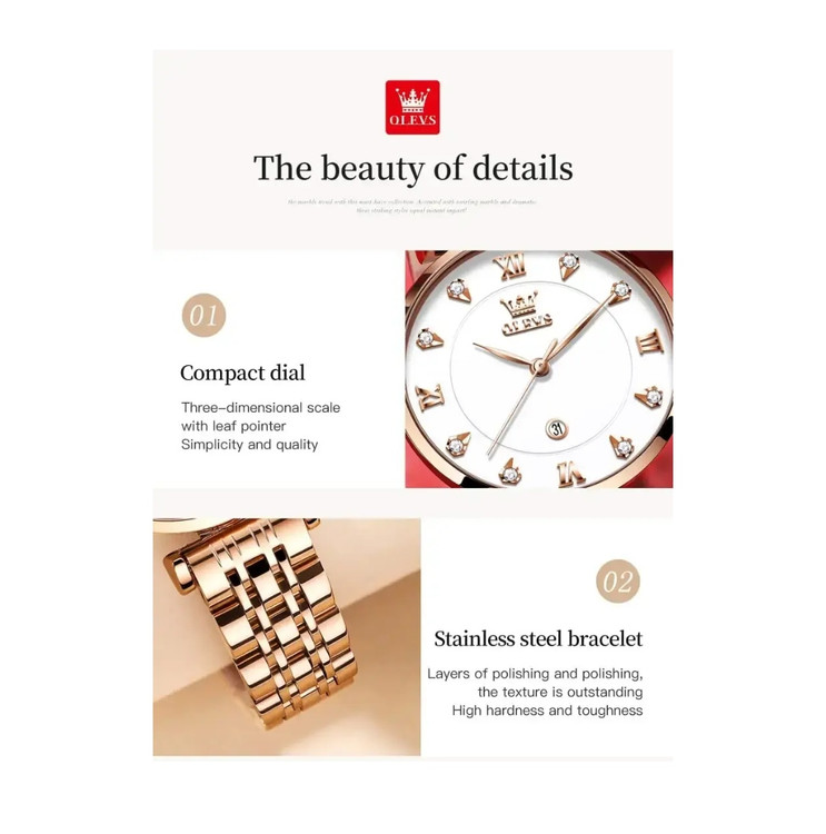 بعنوان خریدار، می توانیم به ظرافت این ساعت توجه کنیم. به نظر می رسد که از بهترین مواد ساخته شده اند .در طراحی و تولید این ساعت، شما فولاد ضد زنگ دارید. این ماده با در نظر گرفتن اینکه بیشتر ساعت ها در آب غوطه ور هستند، دوام محصول را تضمین می کند. می توان گفت که محصولات ساخته شده از فولاد ضد زنگ نوعی از انواع مواد با مقاومت بالاتر هستندساعت ها برای مقاومت در برابر خط و خش و گذر زمان به بهترین شکل ساخته شده اند. گفتنی است طول بند ها با پیچ گوشتی همراه ساعت قابل تنظیم می باشد. همچنین ساعت Olevs دارای حس لوکس بودن و راحتی بیشتری هستند که اغلب برای ساعت هایی که روزانه می پوشیم مورد نیاز است. بنگل همراه با این ساعت از کیفیت عالی برخوردار است.متن نوشته she belived she could so she did